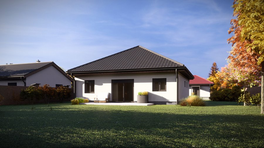 Bungalov Sylva 100 bude tvořit ideální domov až pro čtyřčlennou rodinu. Největší část domu zabírá společenská část se pojenou kuchyní, jídelnou a obývacím pokojem. Tento dům se zastavěnou plochou 105 m 2 je vhodný k umístění menší parcelu.