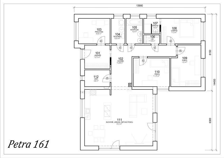 Rozsah dodávky zařizovacích předmětu vychází z projektové dokumentace. Závěsný systém zabudovaný – GEBERIT Zavěšená keramická mísa Prkénko bílé Tlačítko GEBERIT Skříňka s umyvadlem 55cm Vana do ceny 8000,- a sprchový kout do ceny 8000,-.